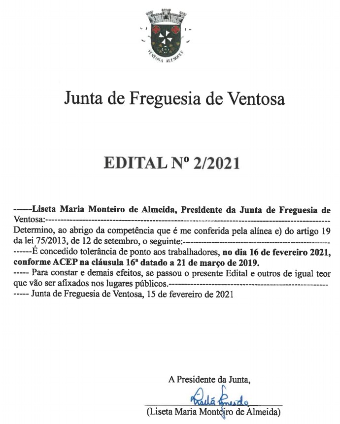 Edital N.º 2/2021 - Tolerância de Ponto